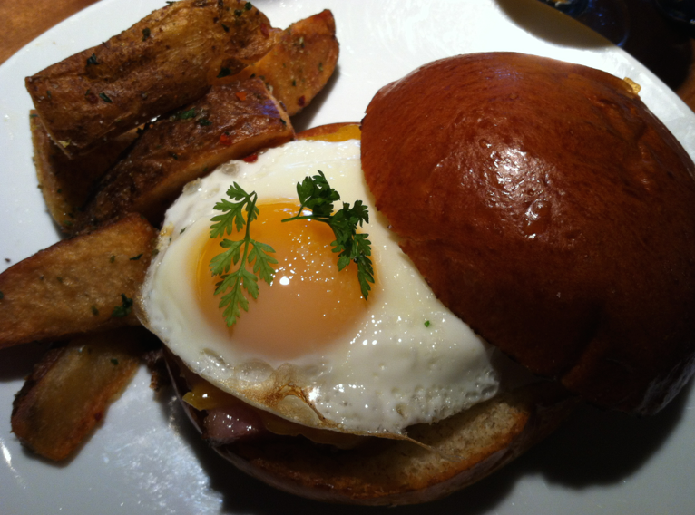 For my main dish, I ordered the Breakfast Sandwich, which is bacon stuffed bacon, a fried egg, and cheddar on a bun with potatoes on the side. Everything is seasoned very well.