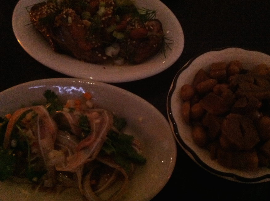 We came for the namesake dish, the Arroz Gordo (Fat Rice), so we ordered that straight away. It takes 30 minutes to cook. So in the meantime, we chose some 3 for $10 "bites". Our selections included boiled peanuts, eggplant, and a pig ear salad. The pig ear salad was probably my favorite. The pig ear was surprisingly soft, almost in noodle-like form, but surrounded by crunchy onions, peppers, and greens to balance out the texture of the bite. The kid was all about the boiled peanuts, which were served cold and topped with mushrooms. The eggplant was tasty, and I don't even like eggplant, but we all decided it was too spicy for us, so I brought the rest home for my partner to enjoy later. Somehow, spicy food doesn't make her nose run like crazy, like it does mine. She must be an alien. I've always half suspected that.